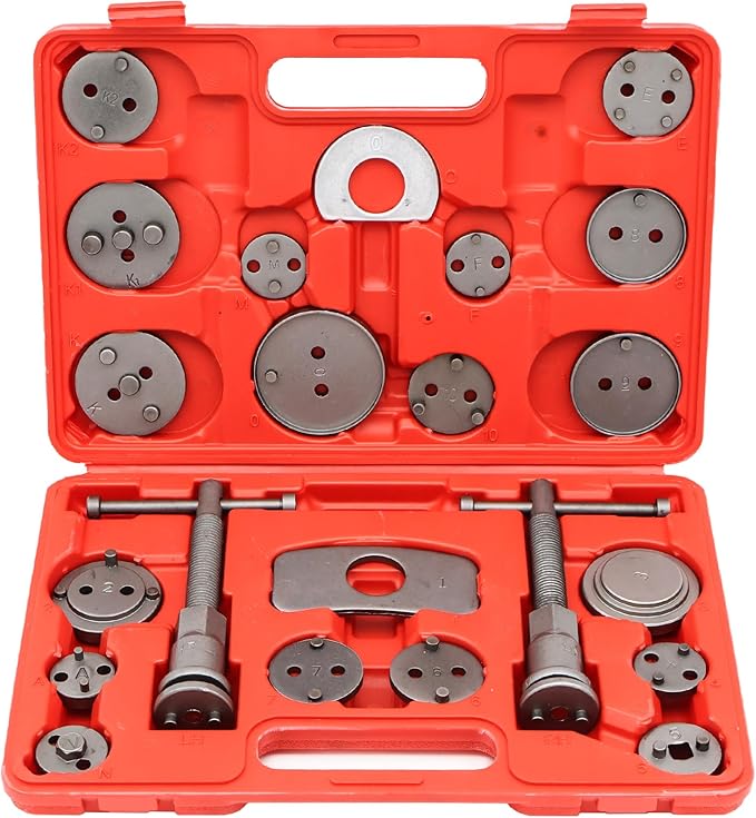 Bremskolbenrücksteller Set enthält ein Links- und Rechtsgewinde, 2 Halteplatten sowie 18 verschiedene Adapter – passend für die meisten Automarken